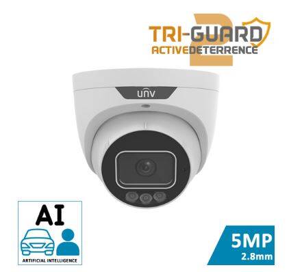 Part of the Uniview Tri-Guard 2.0 series, this turret IP dome camera boasts an impressive 5 megapixel recording resolution with a 2.8mm fixed-focal lens. This camera has the ColourHunter chipset, allowing for full colour at night with sufficient ambient lighting. Supporting Ultra265 compression, up to 30m of IR range and up to 30m of White Light; as well as red and blue warning lights. This camera also has smart video-analytic features built-in, with deep-learning AI. This allows it to accurately detect humans while ignoring other movements such as trees or animals.